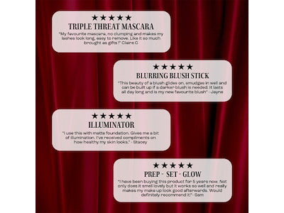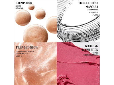 1 x Triple Threat Mascara Black + 1 x Blurring Blush Stick Daiquiri + 1 x Prep-Set-Glow Original + 1 x Mini Illuminator Original
